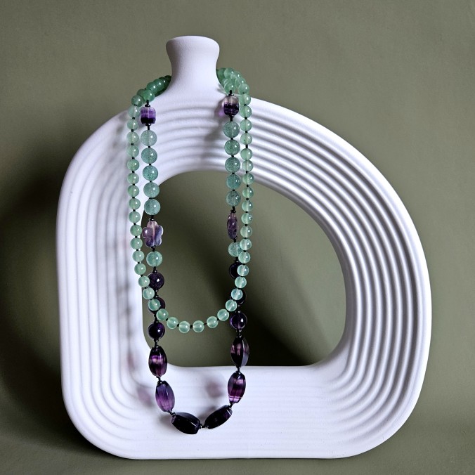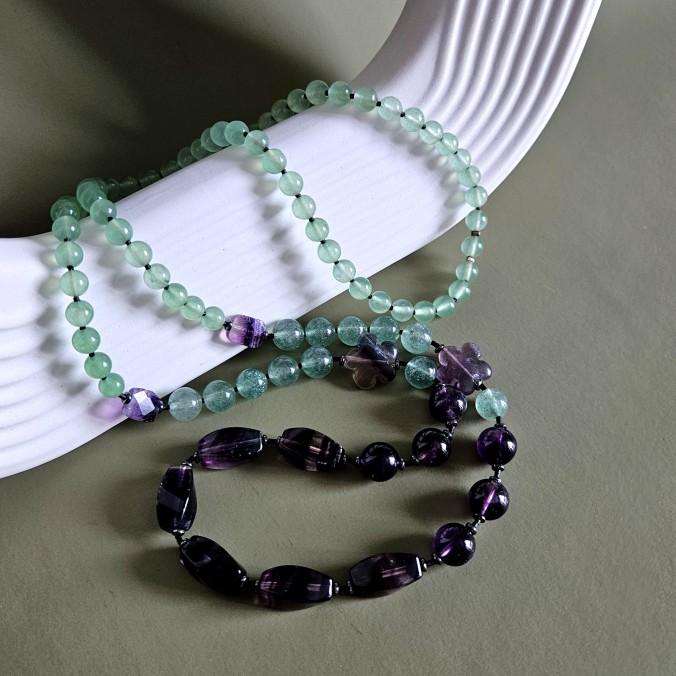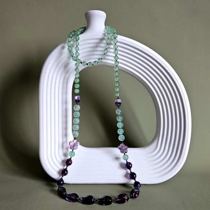 аметист, кварцит зелёно-голубой, агат зеленый, гематит черные диски, бисер черный Япония.